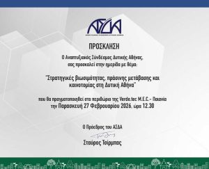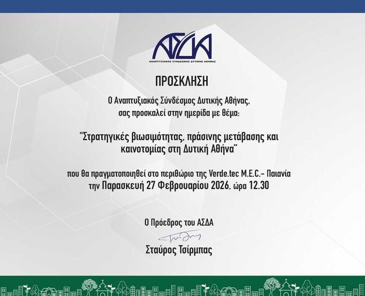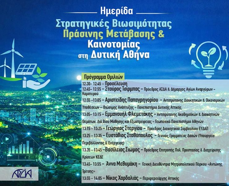 Ο Αναπτυξιακός Σύνδεσμος Δυτικής Αθήνας (ΑΣΔΑ) σας προσκαλεί στην ημερίδα που διοργανώνει με θέμα: «Στρατηγικές βιωσιμότητας, πράσινης μετάβασης και καινοτομίας στη Δυτική Αθήνα»,